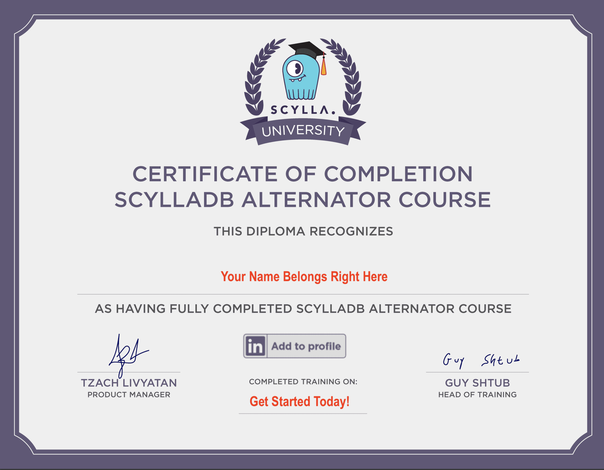 For each course you complete, you get a complimentary certificate. Doing the training helps you gain knowledge for your latest project or for your next role. Gain credibility as a ScyllaDB and NoSQL expert, by sharing your certificates on your LinkedIn profile and show off your achievements.