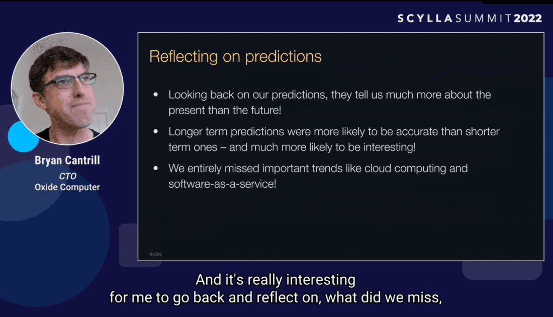 - Bryan Cantrill (Oxide Computer) reviewed 1 year, 3 year, and 6 year technology predictions that he and his former fellow Sun Microsystems colleagues made over the past 20 years and shared his insights on what it all means for the present.