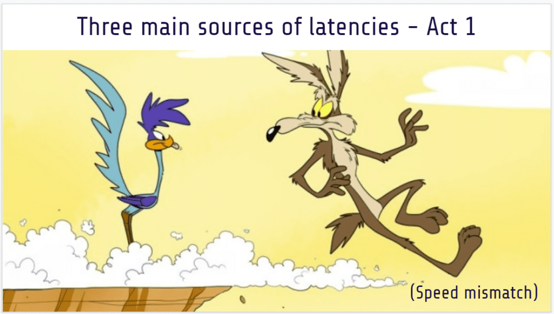 Dor began his keynote by outlining 3 main sources of latency. The first is speed mismatch, most commonly between disk speed and CPU/memory speed. If this mismatch occurs – and the system is not engineered to handle that mismatch – you hit a wall and the P99 latencies are markedly higher than the mean and median latencies. If you’re working on something like a file system or database, this translates to high P99 across the board. After drilling down into the various CPU and I/O differences that drive this speed mismatch, Dor outlines how ScyllaDB addresses it.
