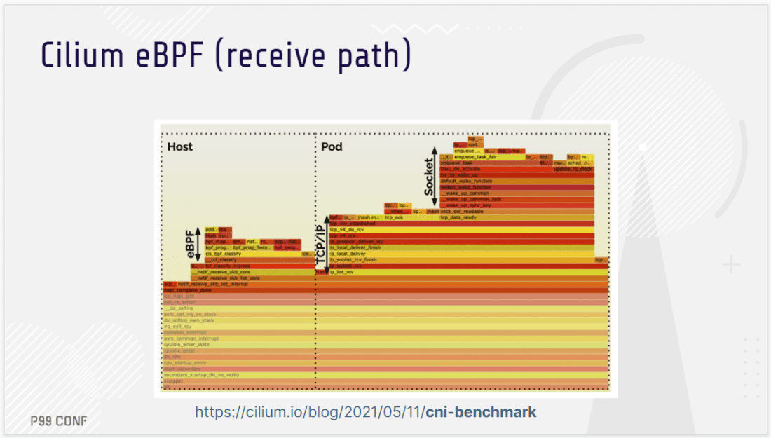 Looking beyond XDP, eBPF programs can be attached to a variety of different points in the network stack – and this is especially helpful when working with the complex networking stack of Kubernetes. As Liz’s demos, flamegraphs, and benchmarks show, this yields yet more opportunities for throughput and CPU gains. Watch the video and see the performance impact for yourself.