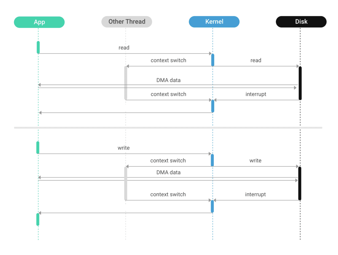 Unless the database engine is an in-memory one, it will have to keep the data on external storage. There can be many options to do that, including local disks, network-attached storage, distributed file- and object- storage systems, etc. The term “I/O” typically refers to accessing data on local storage – disks or file systems (that, in turn, are located on disks as well). And in general, there are four choices for accessing files on a Linux server: read/write, mmap, direct I/O (DIO) read/write, and asynchronous I/O (AIO/DIO, because this I/O is rarely used in cached mode).