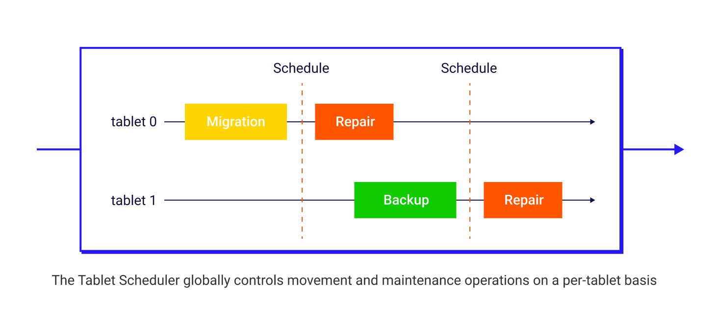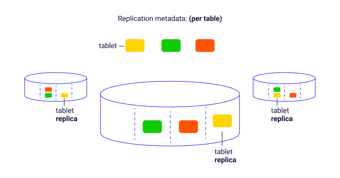 Replication and state management for the tablets across multiple nodes (how many Tablets for each table, token boundaries for each Tablet, which nodes, what kind of transition the tablet is undergoing, and so forth) is handled by Raft consensus metadata as a Raft group. A Tablet scheduler globally controls movement and maintenance operations on a per-Tablet basis. There is a Tablets table that stores all Tablet metadata and serves as a single source of truth for the cluster as its topology evolves (topology state, number of tablets per table, the token boundaries for each tablet, and which nodes and shards have which replicas).